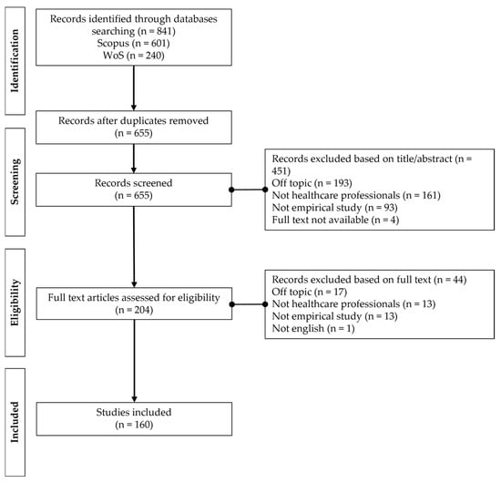 Following the completion of the semi-automated filtering process using database tools, a total of 841 articles were identified and subsequently checked for duplicates. After this step, 655 unique articles remained for further evaluation based on the established inclusion and exclusion criteria. In line with the Preferred Reporting Items for Systematic Reviews and Meta-Analyses (PRISMA) [30], two independent reviewers screened the titles and abstracts to assess their relevance to the research objectives. In cases of discrepancies between the reviewers, group discussions and detailed re-examinations of the studies were conducted until consensus was reached. Only articles unanimously deemed relevant were retained, leading to a refined dataset of 204 documents. A similar strategy was adopted during the final screening phase, in which the full text of the selected articles was reviewed to ensure compliance with the eligibility criteria [25]. As a result, 44 additional articles were excluded, leaving a final dataset of 160 articles. The screening process is illustrated in Figure 1.