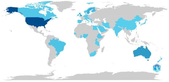 Scientific production by country. Different shades of blue indicate different productivity rates: dark blue = high productivity; grey = no articles.
