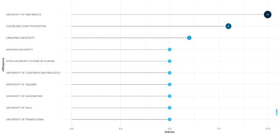 Focusing on affiliations, the University of New Mexico (n = 10) and the Cleveland Clinic Foundation (n = 8), both based in the United States, emerged as the most productive institutions. Ranked third was Linköping University (n = 6) in Sweden, where e-health is one of the key areas of research activity (Figure 4).