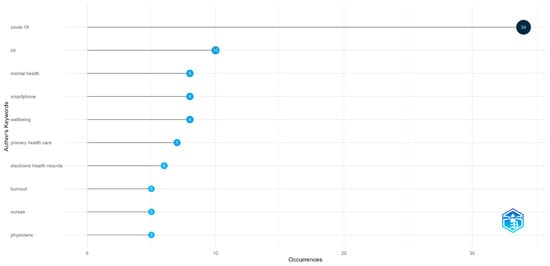 An analysis of authors’ keywords offered valuable insights into the dominant terms in the scientific literature. Notably, terms such as “COVID-19” and “ICT” were among the most frequently occurring words, underscoring their centrality to the discourse. Other frequent keywords included “mental health”, “smartphone”, and “wellbeing” (Figure 5).