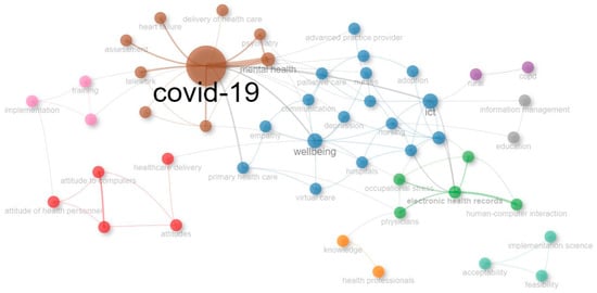 Figure 6 shows that the “COVID-19” cluster emerged as the most relevant area (B = 510.02 and C = 0.01), with a strong connection with “Mental health”. This cluster also includes terms such as “Burnout” and “Psychiatry”. The “Wellbeing” cluster was the second most relevant (B = 217.84 and C = 0.01), showing several associations with the “COVID-19” cluster. It includes terms such as “ICT” (Information and Communication Technology), and “Primary health care”. The “Healthcare delivery” cluster appeared as the third most relevant (B = 96.36 and C = 0.01), with links to the “Wellbeing” cluster. This cluster includes terms such as attitudes and attitudes of health personnel. Notably, the “Acceptability” cluster (B = 0 and C = 0.5), which includes terms such as “Feasibility” and “Implementation science”, appeared disconnected from the other clusters.