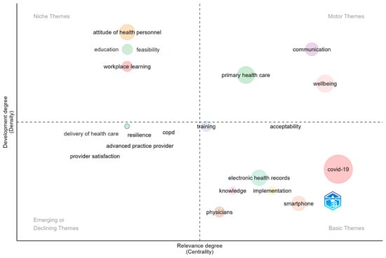 The first quadrant includes “motor themes”, characterized by high centrality and high density. These are well-established and crucial themes that shape the research field. Three motor themes were identified: “wellbeing”, “primary healthcare”, and “communication”, with the first two having similar bubble sizes. The “wellbeing” cluster refers to research on the impact of telemedicine on the wellbeing of both HCPs’ and patients. Studies have explored how telemedicine can affect HCPs’ wellbeing [45], as well as how online mental health programs can support nurses’ wellbeing [35,40]. Other research has investigated HCPs’ perceptions of how ICT use may improve or hinder patients’ wellbeing [46,47]. The “primary health care” cluster explores how telemedicine influences physicians’ work in primary care. For instance, Fernemark and colleagues [48] conducted an in-depth analysis of job demands, job control, and social support for physicians using digital consultations. Additionally, Björndell and Premberg [49] demonstrated that video consultations can enhance physicians’ work situations and wellbeing. Finally, “communication” emerged as a key theme, highlighting the importance of effective communication in telemedicine. Providing virtual care is challenging for physicians, who must reinforce their communication skills and their ability to manage misunderstandings [50,51]. Effective communication is also crucial for maintaining patient engagement [52].