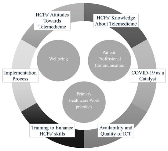 Existing models used to study telemedicine from the perspective of HCPs, such as the Technology Acceptance Model [82] and the Unified Theory of Acceptance and Use of Technology [83], primarily focus on individual cognitive factors (e.g., perceived usefulness, ease of use, or behavioral intention) influencing telemedicine acceptance and the intention to use it [14,22,84]. While these frameworks provide valuable insights into the adoption process, they overlook the broader impact of telemedicine on HCPs’ wellbeing and daily clinical practice.