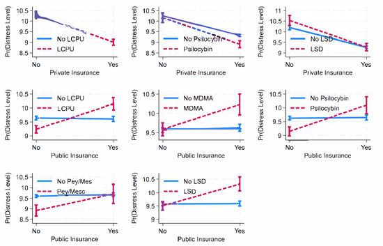 Among men (Supplemental Table S5), while private health insurance is associated with lower distress and public health insurance with higher distress, the interaction terms do not indicate that psychedelic use moderates these associations. On the other hand, among women (Supplemental Table S6), there are more notable interactions between psychedelics and health insurance (Figure 2). While private health insurance is associated with lower distress, this relationship is significantly moderated by psilocybin use (b = −0.609, p < 0.01, Model 3) and LSD use (b = −0.632, p < 0.01, Model 7), meaning that the association between private insurance and lower distress is stronger among those who use these substances. Similarly to among men, public health insurance is associated with higher distress among women, but the interaction terms indicate a broader range of psychedelics amplifying this association. Specifically, the positive association between public health insurance and distress is stronger for those reporting lifetime use of classic psychedelics (b = 1.074, p < 0.001, Model 8), MDMA (b = 0.516, p < 0.05, Model 9), psilocybin (b = 0.852, p < 0.01, Model 10), peyote/mescaline (b = 0.921, p < 0.05, Model 13), and LSD (b = 0.902, p < 0.001, Model 14).