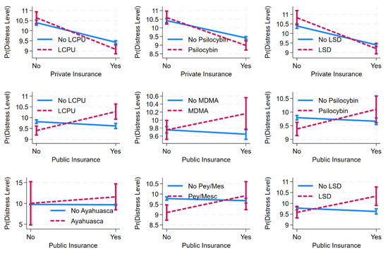 While the results indicate that private health insurance, compared to not having private insurance, is associated with lower distress (Figure 1), interaction terms (Supplemental Table S4) show that this negative association is strengthened for those who have used lifetime classic psychedelics (b= −0.378, p < 0.01 b = −0.378, p < 0.01 b = −0.378, p < 0.01, Model 1), psilocybin (b= −0.318, p < 0.05 b = −0.318, p < 0.05 b = −0.318, p < 0.05, Model 3), and LSD (b= −0.327, p < 0.05 b = −0.327, p < 0.05 b = −0.327, p < 0.05, Model 7). Conversely, although public health insurance, compared to not having public insurance, is associated with greater distress, interaction terms indicate that this positive association is further amplified among individuals who have used lifetime classic psychedelics (b = 0.936, p < 0.001 b = 0.936, p < 0.001 b = 0.936, p < 0.001, Model 8), MDMA (b = 0.582, p < 0.001 b = 0.582, p < 0.001 b = 0.582, p < 0.001, Model 9), psilocybin (b = 0.923, p < 0.001 b = 0.923, p < 0.001 b = 0.923, p < 0.001, Model 10), peyote/mescaline (b = 0.719, p < 0.05 b = 0.719, p < 0.05 b = 0.719, p < 0.05, Model 13), and LSD (b = 0.796, p < 0.001 b = 0.796, p < 0.001 b = 0.796, p < 0.001, Model 14).