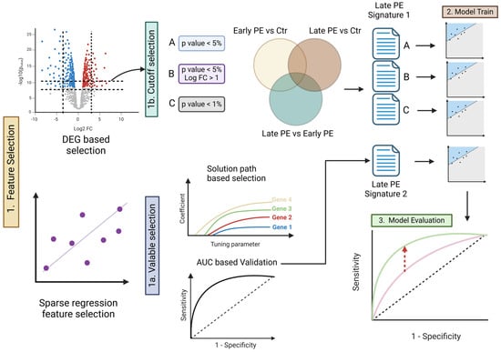 Schematic of the analytical workflow. Panel 1 (feature selection): cfRNA features were prioritized by two complementary routes. 1a Sparse-regression (elastic net) solution paths identified genes whose coefficients remained non-zero across a 50-value λ grid, and the resulting models were validated by AUC. 1b Differential expression (DEG) analysis compared Early-PE vs. Control, Late-PE vs. Control, and Early- vs. Late-PE; three cut-off schemes were explored—A p < 0.05, B p < 0.05 and |log FC| > 1, and C p < 0.01—yielding signature candidates shown in the Venn diagram. In the volcano plot, red dots indicate significantly up-regulated genes, blue dots down-regulated genes, and grey dots non-significant genes. Panel 2 (model training): for each DEG-derived signature (A–C) and for the elastic-net signature, separate elastic-net classifiers were trained on the Late-PE training data. Panel 3 (model evaluation): nested Monte-Carlo cross-validation supplied independent test sets; ROC curves illustrate that Late-PE-specific signatures (green) outperform naïvely transferred Early-PE signatures (pink), while the diagonal denotes chance.