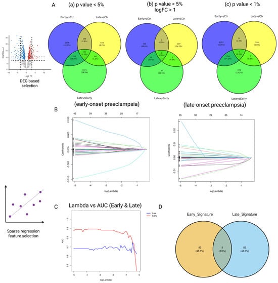 Multi-stage feature selection and signature derivation for early- (EO-PE) and late-onset pre-eclampsia (LO-PE). (A) Differential expression (DEG) stage. Venn diagrams show EO- and LO-specific gene sets obtained under three progressively stringent cut-offs: (a) p < 0.05; (b) p < 0.05 and |log2FC| > 1; (c) p < 0.01. Numbers indicate genes unique to, or shared between, the three pairwise contrasts (Early vs. Ctrl, Late vs. Ctrl, Late vs. Early). (B) Elastic-net solution paths. For each subtype, the coefficients of all candidate genes are traced across the log10(λ) grid; colored curves enter the model as λ decreases, illustrating automatic sparsification. (C) Model-selection curve. Mean outer-loop AUROC vs. log10(λ) for EO- (blue) and LO-PE (red). Plateaus mark the λ values giving maximal discrimination with minimal complexity. (D) Final signatures. Intersecting the optimal EO and LO coefficient sets yields five shared genes (center), with 82 genes retained exclusively in each subtype-specific signature.
