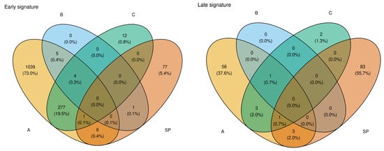 Overlap of gene signatures obtained with four selection strategies for (left) early-onset and (right) late-onset pre-eclampsia. Each Venn diagram contrasts the differential expression cut-offs A (p < 0.05), B (p < 0.05 and |log2FC| > 1), and C (p < 0.01) with the sparsity-optimized elastic-net solution path (SP). Numbers denote the absolute gene count and, in parentheses, the percentage of the total signature size for that subtype. The minimal intersection—five shared genes in the early set and three in the late set—underscores that the early- and late-onset signatures are largely distinct, supporting divergent molecular mechanisms between the two PE subtypes.