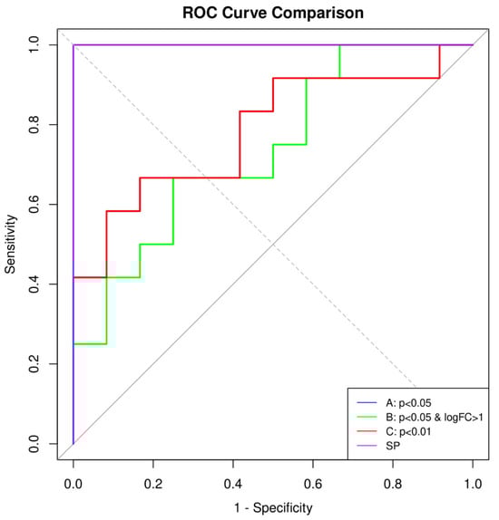ROC curves from 10 repeats of Monte-Carlo cross-validation comparing three late-onset PE gene-signature models. The green, red, and violet lines correspond to signatures derived from cut-off B (p < 0.05 and |log2FC| > 1), C (p < 0.01; identical to A and therefore shown only once), and the sparsity-optimized elastic-net solution path (SP), respectively. Curves are obtained by aggregating predictions from the outer 70/30 test folds (n = 10). The elastic-net model (violet) maintains the highest sensitivity across the entire false-positive-rate range, confirming its superior AUROC in Table 1. Abbreviations: FPR, false-positive rate; TPR, true-positive rate.