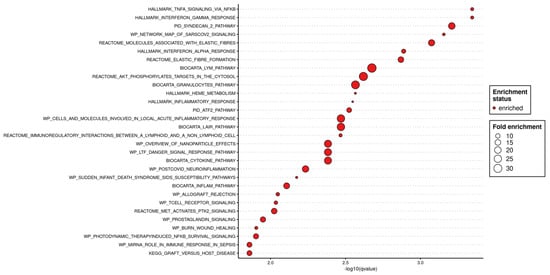 Based on an over-representation analysis of the 87 late-onset-specific genes (Figure 5), the most significantly enriched themes were (i) pro-inflammatory and innate-immune signaling—notably interferon-γ/α and TNF-α → NF-κB cascades, together with adaptive-immune terms such as allograft-rejection/graft-vs.-host pathways—and (ii) extracellular-matrix remodeling and cell-metabolic processes, including elastic-fiber assembly and heme metabolism.
