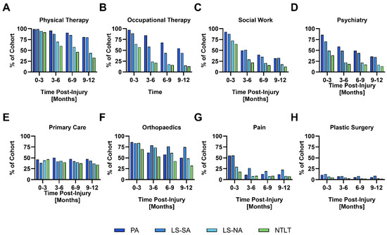 The patterns of clinic engagement by quarter intervals for representative clinics are displayed in Figure 1. The therapy-based clinics such as physical therapy (92–99%), occupational therapy (57–97%), social work (56–93%), and psychiatry (39–86%) have a substantial initial engagement frequency in the first quarter, especially in the PA and LS-SA groups, with SM engagement in 70% and 99% of at least one of the clinics, respectively (Figure 1A–D). After the first quarter, clinic engagement decreases—especially in the LS-NA and the NTLT groups—to a low of 12–13% in the last quarter for occupational therapy, social work, and psychiatry. In contrast, the primary care clinic exhibited a lower rate of engagement during the first quarter (38–46%) but experienced less of a decrease in engagement after the first quarter, with an engagement of 34–47% in months 10–12 (Figure 1E). For the LS-SA group, the rate of engagement at orthopedics (84%), pain (55%), and plastic surgery (13%) clinics was similar in the first quarter compared to the PA group (orthopedics 86%, pain 55%, plastic surgery 11%), but the rate of engagement did not diminish to the same degree as the PA group (last quarter engagement; orthopedics 75%, pain 23%, plastic surgery 9% for LS-SA, and orthopedics 50%, pain 12%, plastic surgery 5% for PA) (Figure 1F–H).