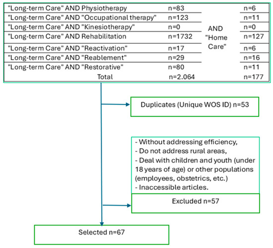 To obtain information on the effectiveness of new therapies in long-term care in other care systems worldwide, we searched the authors’ findings in the Web of Science (WoS) Core Collection. Articles were selected on 12–13 February 2025, covering publications from 1990 to December 2024. They examine the effects of the newly selected services. The flow chart in Figure 1 depicts the trends in article publication within journals indexed in the WoS Core Collection. It shows, outlined in keywords by merging the search terms “long-term care” (LTC) and “home care” (HC), each of the following keywords (the new selected therapies) separately: physiotherapy, occupational therapy, kinesiotherapy, rehabilitation, reactivation, reablement, and restorative.