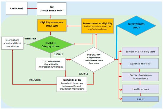 The project evaluated the comprehensive long-term care process, commencing with an application to be served by the user or a family member and concluding with the completion of service utilisation (Figure 2). A singular entrance point was developed for all candidates within the LTC network. A novel approach for evaluating eligibility was tried. Services to maintain independence, health services, and e-care have been added as options to the previously established services, as presented in Figure 2. This is discussed further in the subsequent sections.