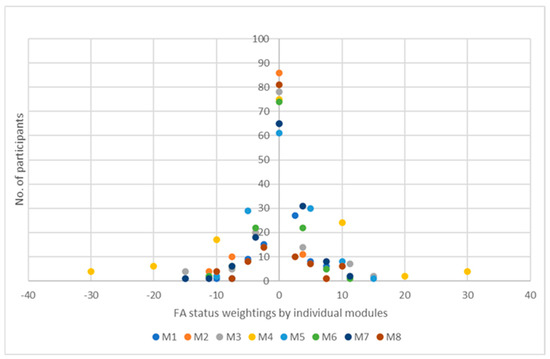 Here, is the number of all responses in the i-th group, and the value is the number of those with the improved value of FA in each module. Despite employing a crude normal approximation for the distribution of differences in beta-distributed percentages, particularly when the percentage does not approximate to 50%, we can still adhere to the proof utilising the Agresti–Caffo estimate of the differences in percentages of individuals with enhanced abilities. The confidence interval for percentage differences can be expressed as follows: