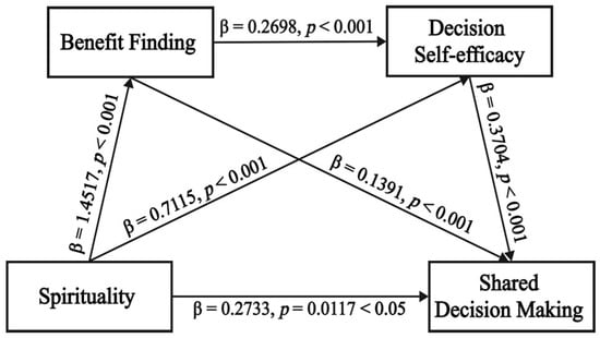 Mahoney suggested that the benefits of spirituality are inspiring life purpose and meaning [26]. Meaning in life involves in the concept of BF [13]. In the field of health, BF refers to the process by which individuals actively seek positive meaning in life and growth opportunities in disease events or states by adjusting cognition and psychological adaptation [27,28]. At present, several theoretical models of BF have showed that finding meaning in life contributes to individual BF [29,30]. The role of spirituality on BF has been well proven. Studies have shown that BF and rumination are the chain mediators between spirituality and medication adherence [31]. The direct effect of BF on individual self-management has been demonstrated in both HF and COPD patients [32,33]. Decision-making ability is the core ability of self-management [34], and self-efficacy is an important component of self-management measurement scales [35]. In addition, qualitative research shows that BF has provided individuals with motivation and hope [36]. In SDM, active patients are more able to participate in SDM and improve the quality of their decision-making. Hope is the motivation of the individual to produce behavior change [37]. Therefore, it is reasonable to hypothesize that BF may influence decision efficacy and SDM, potentially acting as a direct mediator between spirituality and SDM. Although it has been proven that BF changes health behaviors through self-efficacy in medication compliance and healthy eating behaviors [38], so far no studies have mentioned BF in SDM concerning chronic disease management.