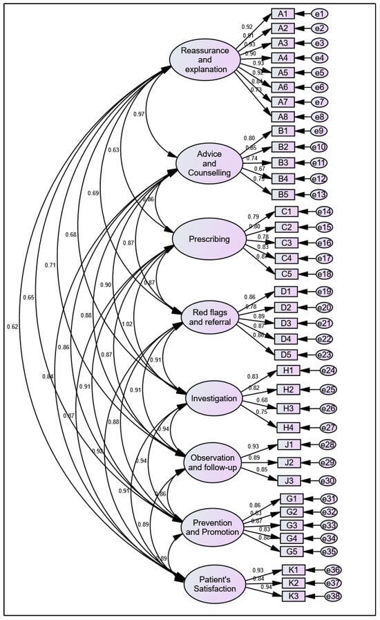 The findings of EFA revealed eight distinct factors that collectively accounted for 86.32% of the total variance, demonstrating excellent sampling adequacy and suitability for factor analysis, as confirmed by standard parameters. The MSA value was above 0.7 for all 38 items, and BTOS yielded χ2 = 16,308.474, p = 0.00, indicating significance. This analysis validated the relevance and suitability of the items for retention, as all factors had eigenvalues greater than 1, and each item exhibited high factor loadings without any cross-loadings detected. These results indicate that the PEDMS is a well-structured instrument comprising 38 items allocated into eight factors, each named according to its content as follows: “Reassurance and Explanation”, “Advice and Counseling”, “Prescribing”, “Red Flags and Referral”, “Investigation”, “Observation and Follow-up”, “Prevention and Promotion”, and “Patient’s Wants, Needs, and Satisfaction”. Each factor effectively captures various dimensions of patient experience related to management plans.