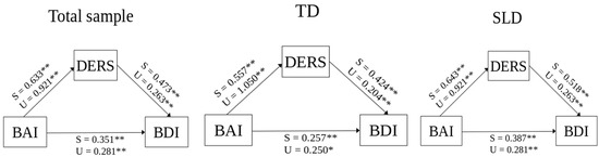 As shown in Table 4, in the total sample, TD sample, and SLD group, BAI had a positive and statistically significant direct influence on BDI (total sample: β = 0.351, p < 0.001; TD: β = 0.275, p < 0.05; SLD: β = 0.387, p < 0.001). In the three groups, BAI positively and significantly influenced the DERS total score (total sample: β = 0.633, p < 0.001; TD: β = 0.557, p < 0.001; SLD: β = 0.643, p < 0.001). Concerning the association between DERS total score and BDI, the DERS total score had a significant positive influence on BDI in the total sample (β = 0.473, p < 0.001), TD group (β = 0.424, p < 0.001) group, and SLD group (β = 0.518). As reported in Table 4, the mediation analysis (Figure 1) showed that, in the three groups, the indirect effect of BAI on BDI, mediated by DERS total score, was significant (total sample: β = 0.299, p < 0.001; TD: β = 0.236, p < 0.001; SLD: β = 0.333, p < 0.001). The multigroup analysis (MGA) indicated no significant differences between groups in the mediation model paths (see Table 5).