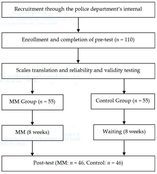 A total of 110 active-duty police officers were initially recruited through department-wide announcements and internal communication channels. Of these, 92 officers met the eligibility criteria and were randomly assigned to either the mindfulness meditation intervention group (n = 46) or the waitlist control group (n = 46). The randomization process was conducted using a computer-generated randomization sequence, with allocation concealed from participants until after baseline assessments were completed.