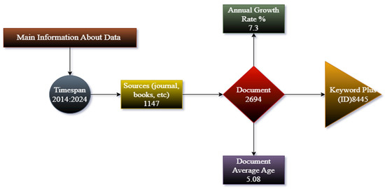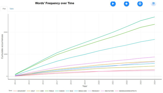 The results are based on primary information about data taken from R Biblioshiny analysis on 14 September 2024. Data were taken from 2014 to 2024; the dataset includes 2694 documents from 1147 journals, books, and other sources, with a 7.3% annual growth rate. The average age of documents is 5.08 years, and the analysis includes 8445 Keywords Plus (I.D.). The most frequently occurring words are “humans” (2694), “female” (2360), and “male” (1672), followed by terms like “risk factors” (875), “adult” (678), and “pregnancy” (652). Specific health-related terms such as “middle-aged” (582), “adolescent” (302), and “smoking/adverse effects” (252) further highlight the scope of the research (Figure 1).