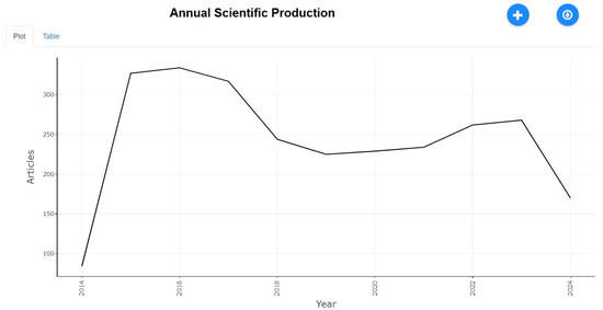 Bibliometric analysis studies scientific literature by evaluating publications in a specific field or academic journal over time. It utilizes numerical and statistical methods to assess the annual production of research articles, as referenced in [34]. Figure 2 showcases the yearly trends in tobacco-related research from 2014 to 2024. The data indicate substantial fluctuations in research output across the years. From 2014 to 2016, there was a dramatic rise in publications, escalating from 84 articles in 2014 to over 330 in 2016, signaling an increasing interest in tobacco-related health issues. However, after 2017, the number of publications started to decrease, hitting a low of 225 articles in 2019. This reduction may reflect changes in research funding priorities or shifts in public health focus areas. A resurgence was noted in 2021, coinciding with the COVID-19 pandemic, which rekindled discussions on respiratory health, smoking-related comorbidities, and the effects of tobacco use during the pandemic. Between 2021 and 2023, the number of publications remained fairly stable, fluctuating between 250 and 270 articles per year. In contrast, 2024 saw a significant decline in publications, potentially indicating a shift in research focus or a decrease in funding availability. Thematic analysis reveals that key research topics over the past decade have consistently included lung cancer, cardiovascular diseases, and the health implications of both smoking and smokeless tobacco. Importantly, after 2017, there has been an increasing focus on electronic nicotine delivery systems (e-cigarettes) and the social determinants of tobacco use, highlighting shifting research priorities and ongoing regulatory debates.