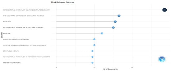 Figure 3 highlights the top relevant sources for tobacco-related content. The International Journal of Environmental Research and Public Health leads with 57 publications, followed by the Cochrane Database of Systematic Reviews (33) and PLOS ONE (31). Other notable sources include the International Journal of Molecular Sciences, Medicine, Addiction, and Nicotine & Tobacco Research. The presence of journals across public health, clinical, and molecular domains signifies the interdisciplinary scope of tobacco research, reflecting how health, behavioral science, and biomedical fields intersect in addressing tobacco use and its impacts. When compared with similar bibliometric reviews (e.g., Sharma et al., 2023; Li et al., 2020) [26,29], a consistent pattern emerges—IJERPH, PLOS ONE, and Addiction often appear among the top contributors, confirming their central role in tobacco-related dissemination. This also aligns with recent trends where public health journals are increasingly prioritizing tobacco control as a core issue.