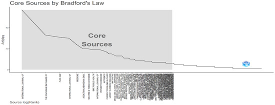 Figure 4 illustrates Bradford’s Law, which indicates that a small number of core journals produce the majority of tobacco-related publications. Introduced by Samuel Clement Bradford in the 1930s, this law ranks journal productivity by dividing them into zones, each containing an equal number of articles. The ratio between the core and outer zones follows the pattern 1:n:n2 […]2, helping analyze the distribution of literature across fields [36,37]. The top 10 journals in Zone 1 dominate the field, with the International Journal of Environmental Research and Public Health leading with 57 articles, followed by the Cochrane Database of Systematic Reviews with 33 articles and PLOS ONE with 31 articles. Other key contributors include Addiction, Nicotine & Tobacco Research, and BMC Public Health, highlighting the interdisciplinary nature of tobacco research across clinical, public health, and molecular sciences. This distribution underscores the central role of a few high-impact journals in shaping the field. This highlights the dominant role of a few critical journals in shaping research in the field.