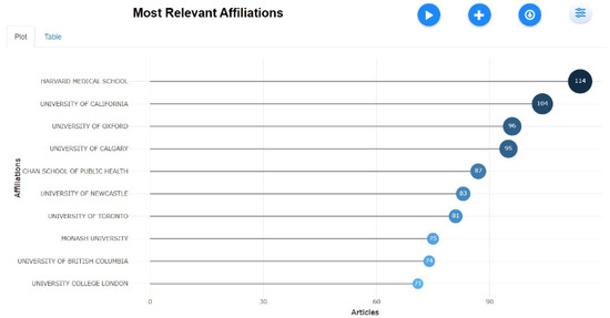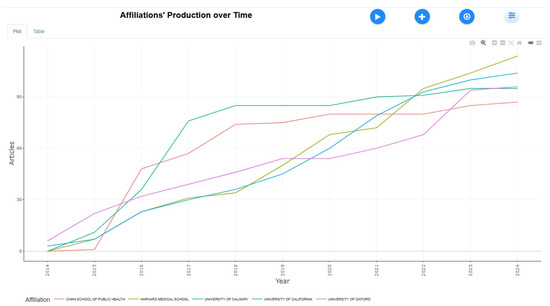 Figure 11 shows that the Chan School of Public Health steadily increased its output to over 90 articles by 2023. Harvard Medical School’s growth was moderate, reaching 80 articles but slowing after 2021. Starting slowly, the University of Calgary accelerated its output post-2017 to get 90 articles. The University of California experienced early significant growth but plateaued after 2018, ending with 85 articles. The University of Oxford showed steady growth, with a notable rise after 2020, reaching 80 articles. All institutions demonstrated upward trends with varying growth rates. A comparison with the bibliometric review by Zhang et al. (2022) [25] reveals similar institutional trends but notes that publication rates from LMIC universities remain relatively stagnant. This again highlights the need for investment in global tobacco control research infrastructure.
