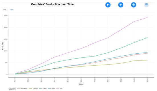 Figure 13 illustrates the varying research outputs on tobacco studies from 2014 to 2023 across different countries. The fastest-growing country is expected to surpass 2000 articles by 2023, while another shows steady growth, reaching around 1500 articles. A third group demonstrates moderate growth, nearing 1000 articles, whereas others display a slower but steady increase, totaling around 500 articles. Some countries exhibit minimal growth, remaining below 500 articles. The United States leads in tobacco research, with a significant rise from 45 articles in 2014 to 2418 in 2024, followed by China, which increased from 27 articles to 1569 in the same period. Italy and Australia show moderate growth, reaching 940 and 900 articles, respectively, by 2024, while Canada records the slowest growth, with 609 articles. These data highlight the dominance of the U.S. and China in global tobacco research, while other nations contribute steadily at comparatively lower levels.