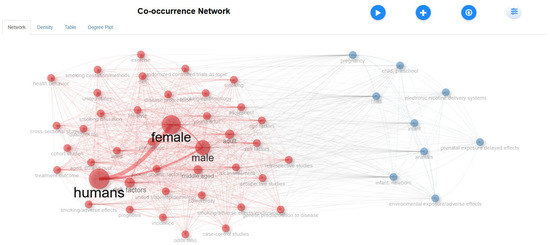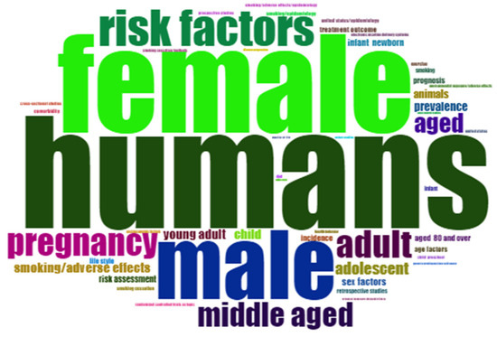 Figure 15 presents the bibliometric analysis, highlighting a strong focus on human-centered research, with the terms “humans” (2694 occurrences), “female” (2360), and “male” (1672) being the most frequent. Key themes include risk factors (875), pregnancy (652), smoking (252), and epidemiological studies (prevalence: 219, risk assessment: 162, prospective studies: 83). Age-related terms like “middle-aged” (582), “adolescent” (302), and “infant/newborn” (168) suggest a broad demographic scope. Smoking-related research is prominent, encompassing “smoking cessation” (92) and “electronic nicotine delivery systems” (73). Lifestyle and socioeconomic influences are evident in “diet” (70), “health behavior” (70), and “quality of life” (65). Genetic and environmental factors, such as genetic predisposition to disease (60) and environmental exposure (71), are also significant. The rise of COVID-19-related terms, such as “ACE2” and “SARS-CoV-2”, reflects recent health trends. Overall, the data underscores public health, disease prevention, and emerging concerns, including e-cigarettes and pandemic-related research.