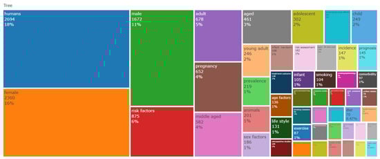 The tree map of the current review illustrates the distribution of key terms in the dataset, with larger blocks representing higher frequency. Figure 17’s tree map shows a strong focus on disease outcomes related to smoking and demographics. The most significant areas are “humans” (18%), “females” (16%), and “males” (11%). Other notable topics include “risk factors” (6%), “pregnancy” (4%), “adults” (5%), and “aged” (3%). Smaller topics like “smoking”, “exercise”, and “diet” are less emphasized. Rectangle sizes indicate the importance or prevalence of each topic.