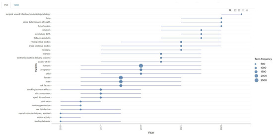 Figure 18 highlights a growing focus on new tobacco products like e-cigarettes alongside traditional concerns such as lung cancer and cardiovascular diseases. Research trends evolved over time, with increasing attention to “electronic nicotine delivery systems”, “risk factors”, and “social determinants of health” after 2017. Topics like “odds ratio”, “aged 80 and over”, and “cross-sectional studies” peaked around 2017, while interest in “lung cancer” and “cardiovascular risk” declined after 2019. From 2021 to 2023, emerging topics included “surgical wound infections”, “quality of life”, and “feeding behavior”.