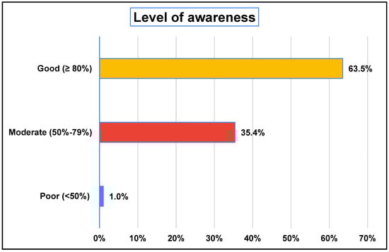 All collected data were reviewed and cleaned for completeness and consistency prior to analysis. Responses with missing values or internal inconsistencies were excluded. Each variable was coded and anonymized to ensure confidentiality. Descriptive statistics are used to summarize participant characteristics. Categorical variables are expressed as frequencies and percentages, while continuous variables are presented as the means and standard deviations or medians and interquartile ranges, depending on data distribution. The Kolmogorov–Smirnov test was used to assess the normality of continuous variables. Non-parametric tests, including the Mann–Whitney U and Kruskal–Wallis tests, were applied for comparison of awareness scores across groups. Associations between awareness or practice levels and categorical sociodemographic and behavioral variables were assessed using Chi-squared tests. Where assumptions were not met, the Monte Carlo correction was applied to ensure accurate significance estimation. All statistical tests were two-tailed, with a p-value < 0.05 considered statistically significant. Analyses were performed using IBM SPSS Statistics version 25.0 (IBM Corp., Armonk, NY, USA).