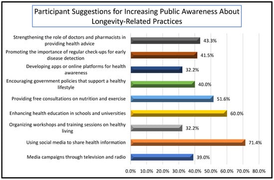 The participants identified lifestyle choices (84.3%) and mental health (75.2%) as the most influential factors affecting longevity, followed by genetic predisposition (48.4%). Environmental factors (36.2%), religious practices (29.1%), and medical advancements (25.1%) were also acknowledged, although to a lesser extent. As illustrated in Figure 2, when asked about strategies to enhance public awareness of longevity-related practices, the majority favored the use of social media platforms (71.4%). This was followed by integrating health education into schools and universities (60.0%) and providing free consultations regarding nutrition and exercise (51.6%). Additional recommendations included conducting media campaigns (39.0%), promoting regular health check-ups (41.5%), implementing supportive government policies (40.0%), strengthening the role of healthcare professionals (43.3%), and developing digital health platforms (32.2%). These findings reflect a strong interest in both personal and system-level approaches to improving long-term health outcomes.