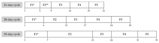 Phase identification was determined based on the self-reported first day of menstruation and prospective self-tracking during the following month. In participants with cycles longer or shorter than 28 days, an individualized phase adjustment was performed by adding or subtracting extra days to the F2 (Figure 1), as this is the most variable phase of the MC [2]. No hormonal markers were used to identify MPs. However, as participants reported regular MCs over the previous six months, no alterations in the physiological patterns of normal hormonal fluctuations were expected.