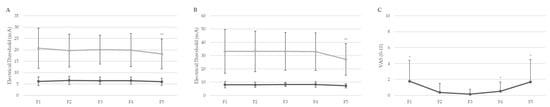 Comparative analysis of sensory and pain thresholds across menstrual cycle phases in entire sample. (A) SET (lower) and PET (higher) in non-referred pain area; (B) SET (lower) and PET (higher) in lower abdomen; (C) VAS scores. F1–F5 refer to the different phases of the menstrual cycle. Data are presented as mean ± standard deviation. * p < 0.05; ** p < 0.01. PET: Pain Electrical Threshold; SET: Sensory Electrical Threshold; VAS: Visual Analog Scale.