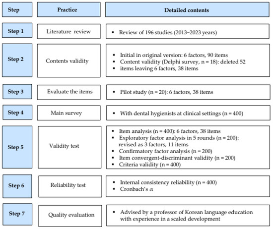 To identify and collate the initial scale items, we conducted a review of 196 domestic and international studies on communication competency published between 2013 and 2023. Based on this review, 90 preliminary items were selected, drawing on the Communication Ability Scale for Medical Students developed by Jeong and Kim [20] and the Communication Competency Scale for Nurses developed by Kim [5]. These items were then refined and adapted for self-assessment by dental hygienists working in dental clinics and hospitals. To enhance validity and reliability, two experts reviewed and refined the wording of each item, finalizing the initial scale.
