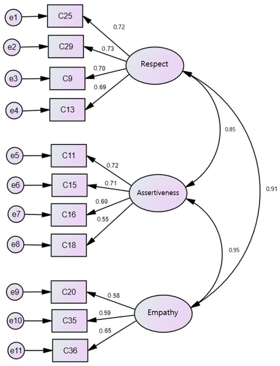 For convergent validity, all standardized lambda (λ) values exceeded 0.50. AVE values were 0.533 for Assertiveness, 0.472 for Empathy, and 0.614 for Respect. CR values were 0.818 for Assertiveness, 0.728 for Empathy, and 0.864 for Respect, all meeting the convergent validity criteria (Table 3 and Figure 3).
