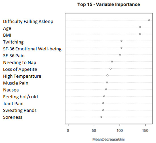 We next predicted sleep reversal using a random forest classification algorithm. The most robust model was made through oversampling and composed of the following 15 variables: difficulty falling asleep, age, BMI, twitching, SF-36 emotional well-being, SF-36 pain, needing to nap, loss of appetite, high temperature, muscle pain, nausea, feeling hot/cold, joint pain, sweating hands, and soreness. Figure 1 shows a plot visualizing the mean decrease Gini of the features in the final model. The mean decrease Gini plot shows that difficulty falling asleep, age, and BMI were the most prominent features in the random forest model. A 95% confidence interval of the AUC was built from the 31 iterations of the final model: (0.7643:0.7831).
