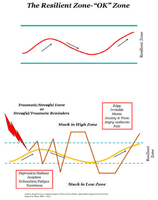 Within a psychosocial frame, most sources of stress originate from the self, other persons, and environmental (SOE system) threats. The more difficult or psychologically complex the stress, the more overwhelmed we become, and the more likely we are to be pushed out of the Resilient Zone. This leaves us vulnerable to becoming “stuck” in a dysregulated high- or low-arousal state. Ultimately, if this dysregulated physiological stress cycle persists, there is an increased risk of chronic physical and mental health disorders, as has been well documented as consequences of ACEs [6]. Visceral interoception (i.e., sensing activity of heart, lungs, and gut) is associated with the ability to access the generative results of sensory processing in the form of emotional feeling, intensity, and discernment.