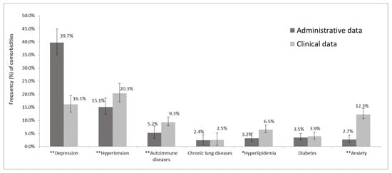 Frequency of major comorbidities in administrative and clinical data. * p < 0.05 and ** p < 0.001 by McNemar’s test; the bars represent the 95% CI of proportion comorbidities.