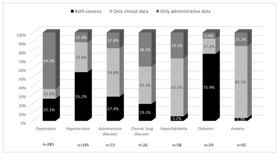 Our results showed that the frequency of single comorbidities varies depending on the data source. Overall, the administrative data tended to underestimate the occurrence of some comorbid conditions (hypertension, autoimmune diseases, hyperlipidemia, and anxiety), but over-reported depression. Under-reporting by administrative databases is consistent with the results obtained in other studies, and also in different populations, and may be due to a tendency to include more symptomatic than asymptomatic conditions [22,23]. However, other studies revealed fair agreement for depression. In particular, the results for depression could be a reflection of the under-diagnosis of mental health issues linked to individuals’ unwillingness to seek treatment for them [24,25].