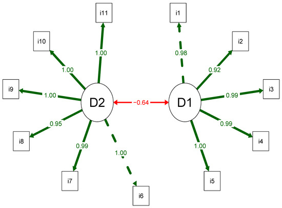 Path diagram of the Brazilian Portuguese IC, with two domains and 11 items.