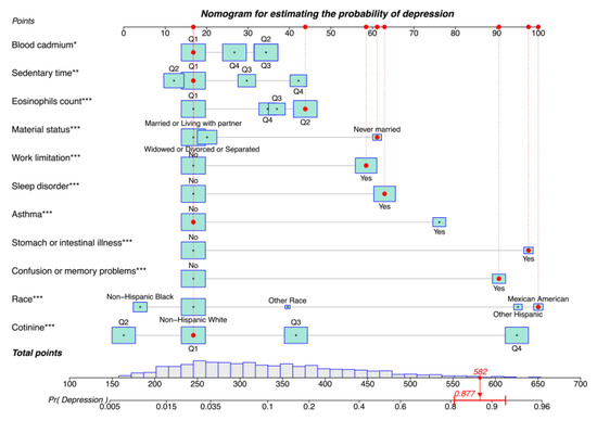 Nomogram for estimating the probability of depression. Asterisks represent statistical significance: * p < 0.05, ** p < 0.01, and *** p < 0.001.