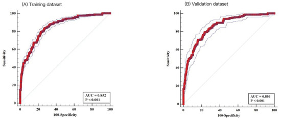 Receiver operating characteristic (ROC) analysis. Nomogram demonstrated good discrimination for depression in patients with cardiovascular disease: (A) the training dataset (area under the curve [AUC]: 0.852; 95% confidence interval [CI]: 0.842–0.862) and (B) the testing dataset (AUC: 0.856; 95% CI: 0.838–0.872).