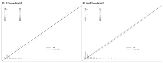 Calibration curves for the training and validation datasets. Calibration plots showing the high accuracy of the absolute risk prediction for depression: (A) training dataset (Emax = 0.060, Eavg = 0.012, p = 0.955) and (B) testing dataset (Emax = 0.039, Eavg = 0.011, p = 0.658). If the nomogram has good calibration, a 45-degree diagonal line will be present between the actual depression rate (y-axis) and predicted depression probability (x-axis). The lack of statistical significance (p > 0.05) indicates good calibration, with no difference between the actual and predicted probabilities.