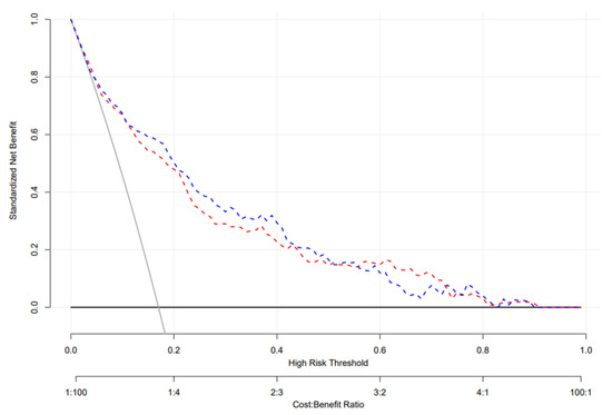 Decision curve analysis of the testing and validation datasets. The decision curve provided greater benefits of the prediction model across the range of 15 to 80%. The blue and red dashed lines indicate the nomograms in the training and validation datasets, respectively; the brown solid line indicates the assumption that all patients are treated, and the dark solid line indicates the assumption that no patient is treated.