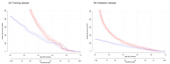 Clinical impact curve analysis for probability stratification of 1000 subjects using a bootstrap random sampling method. At the same horizontal coordinate (high-risk threshold), the vertical coordinates of high-risk patients (blue dashed line) and high-risk patients with depression (red solid line) were compared in the training (A) and validation (B) cohorts. If the vertical coordinate of the red solid line is higher than that of the blue dashed line, it is considered clinically significant at that point.