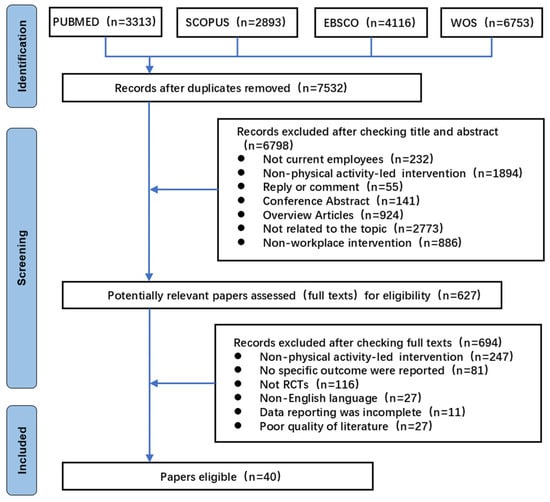 This study ultimately included 40 RCTs investigating workplace interventions primarily focused on PA. The systematic literature selection process is illustrated in Figure 1. Of the 40 finally included studies, 22 were from PubMed, 10 from WOS, 6 from Scopus, and 2 from EBSCO/SPORTDiscus. This distribution shows the centralization trend of RCT-related PAWHI studies in biomedical and multidisciplinary databases.