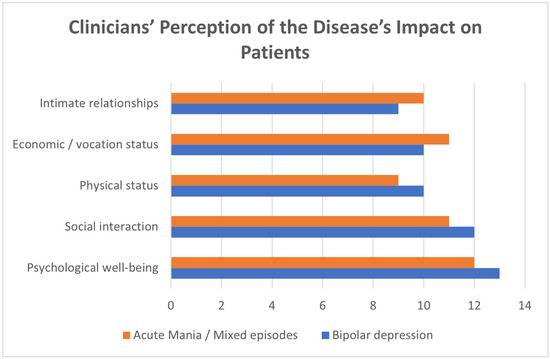 Clinicians recognize how the disease affects psychological, social, physical, economic/vocational, and relational aspects of patients’ lives. Figure 3 illustrates clinician’s perception of the disease impact of both bipolar depression and acute mania/mixed episodes based on their clinical encounters.
