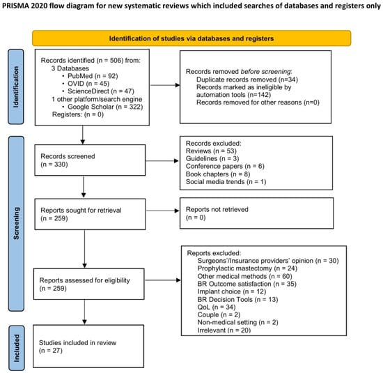A systematic search was conducted across the following databases: PubMed, ScienceDirect, and OVID. Google Scholar was also used as a supplementary source to identify potentially relevant peer-reviewed articles not captured through traditional databases. The searches were conducted using structured keyword combinations, and the results were screened systematically, with only peer-reviewed journal articles considered for inclusion. The following keywords were used: breast cancer OR ductal carcinoma in situ OR mastectomy NOT prophylactic AND breast reconstruction AND influencing factors AND decision-making.